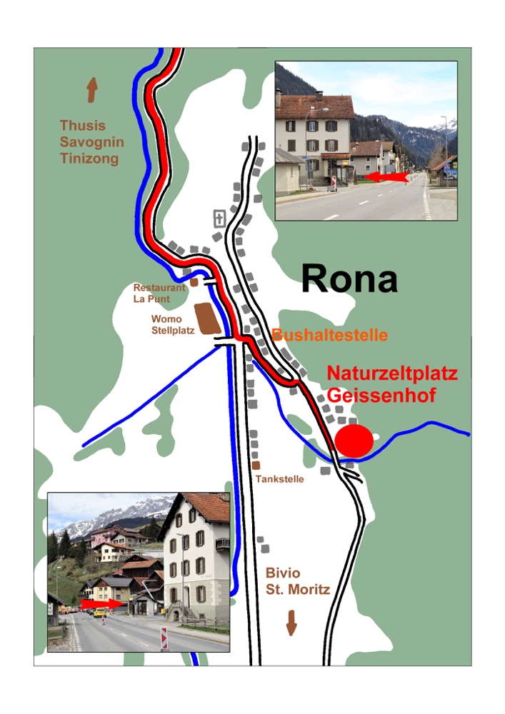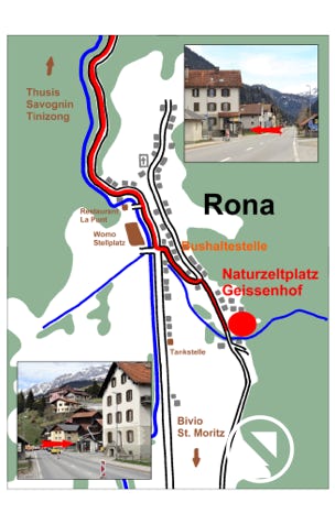 Der Naturzeltplatz beim Geissenhof in Rona liegt mitten im Parc Ela zwischen Savognin und Bivio. Der Geissenhof ist mit öffentlichen Verkehrsmitteln sehr gut erreichbar. Es stehen einige Parkplätze zur Verfügung. Für Wohnmobile oder Wohnwagen stehen 12 Plätze zur Verfügung.